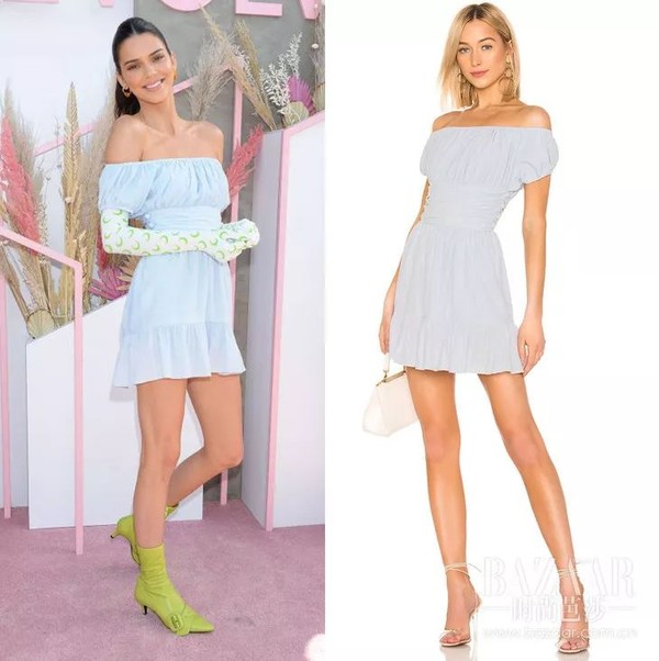 前几天参加活动的Kendall少女气满满,一袭浅蓝色泡泡袖连衣裙实力抢镜,皮筋箍着的肩部细节收缩领口,整体看起来甜美又性感。