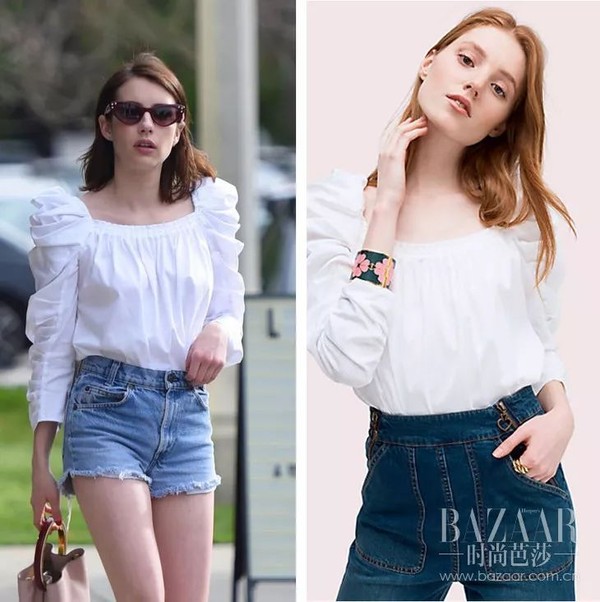 Emma Roberts也穿上了小方领的泡泡袖上衣,看起来像个赶着去上课的女孩。皮筋将领口和袖子收紧形成大小不一的褶裥,一件素净的白上衣便多了许多细节感,舒服自然的打扮让人十分想亲近。