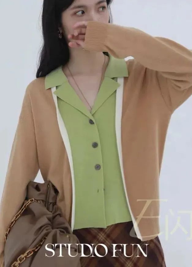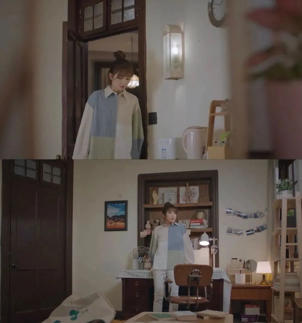 初礼在剧里选择的衬衫都很值得一看,Studio Fun的假两件绿棕拼色衬衫,搭配白色阔腿裤,简洁又不失优雅。