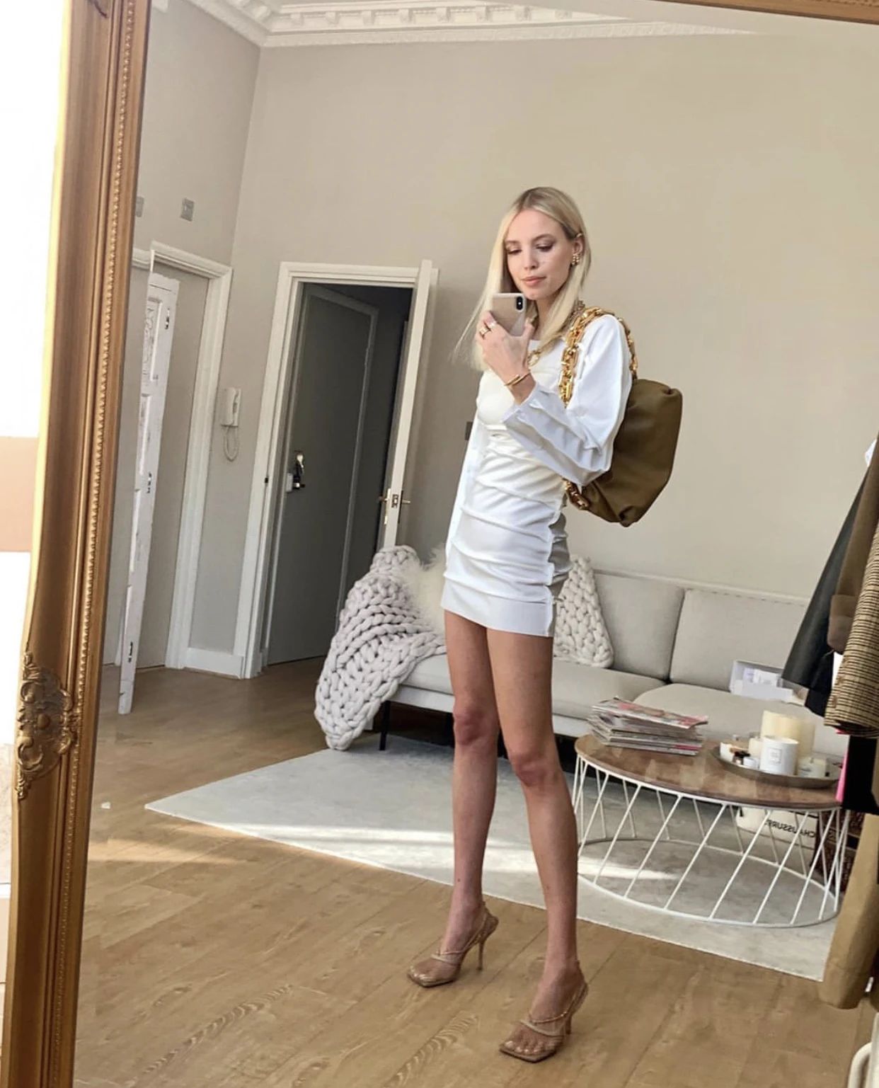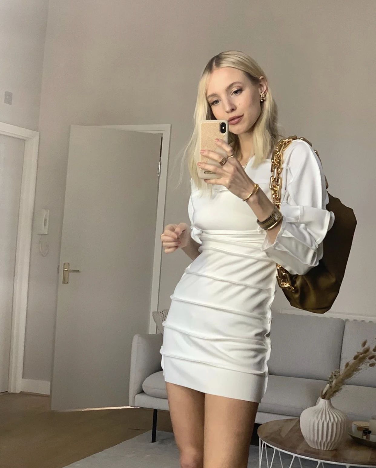 博主Leonie Hanne的这款白色连衣裙也异曲同工,包臀和运用多条缝线设计,整个身体曲线都被勾勒了出来。