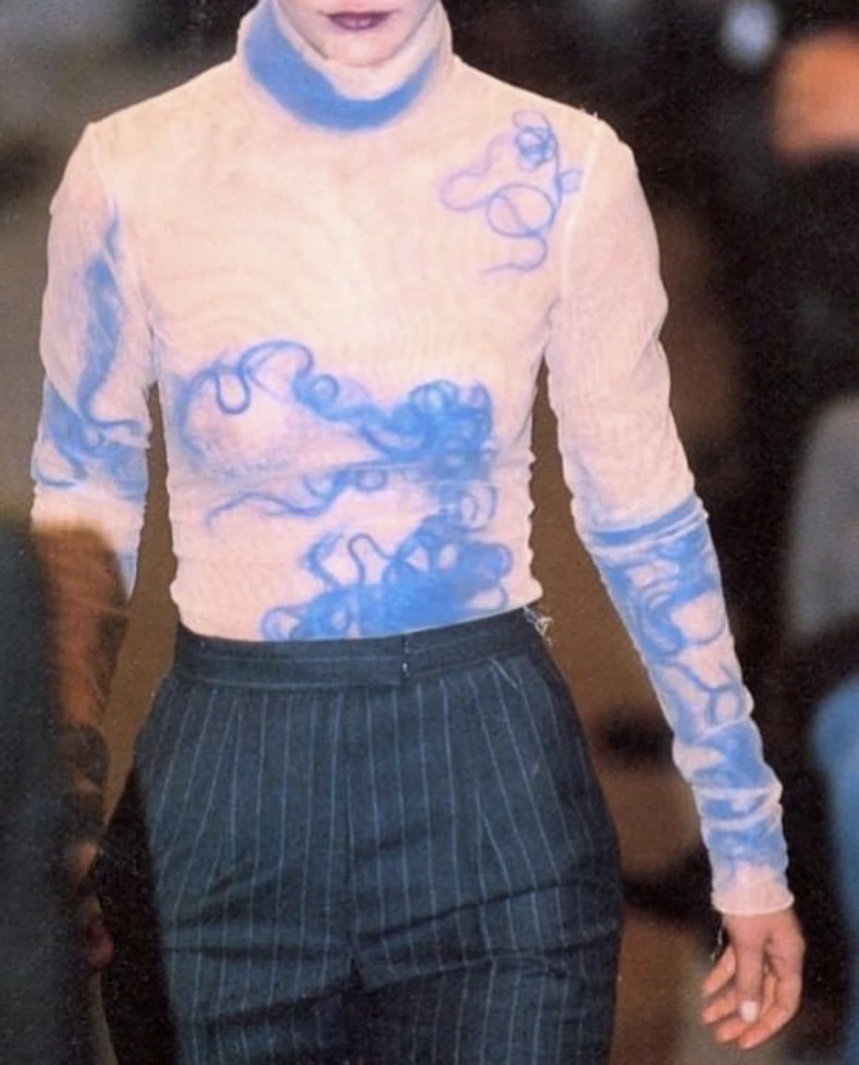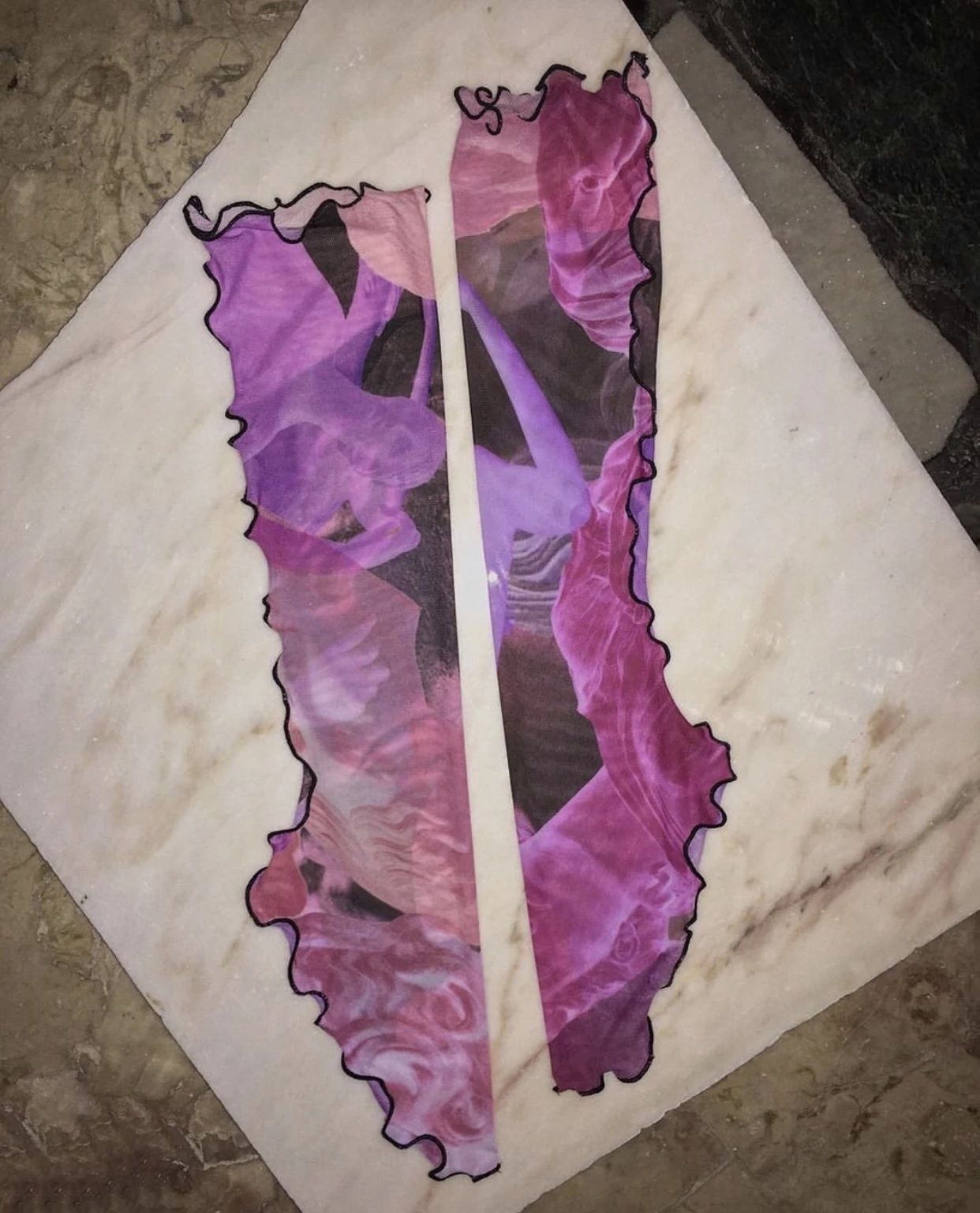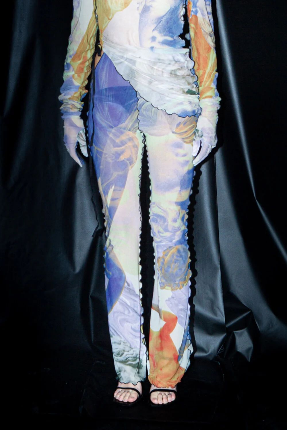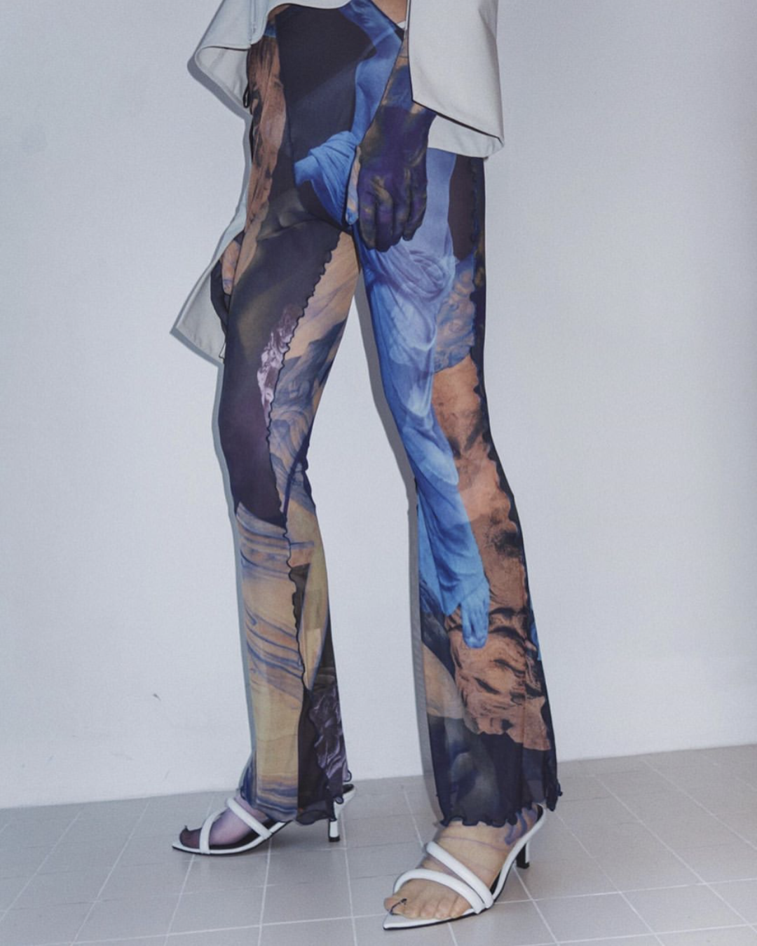 还有这款印花网状镂空裤子,一对网纱长裤,饰有AUNÉ的TROMPE L'ŒIL雕塑作品,由柔软的网眼面料制作而成。侧面露出波浪状边缘针脚。
