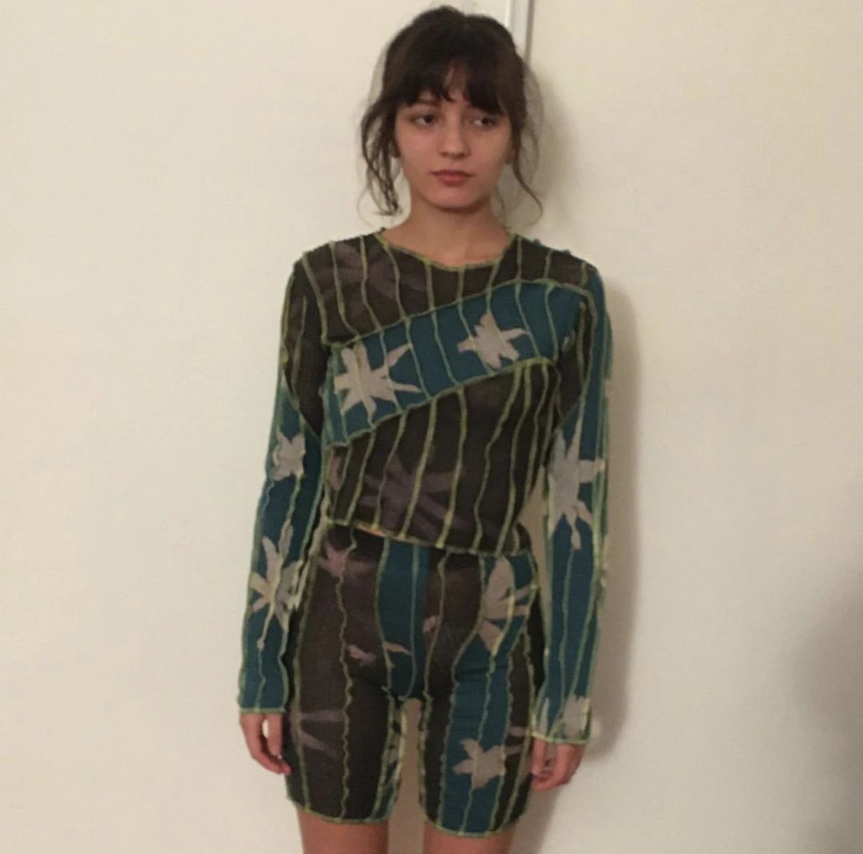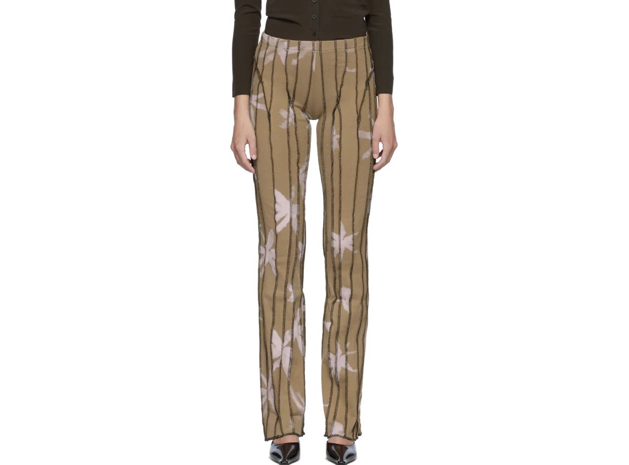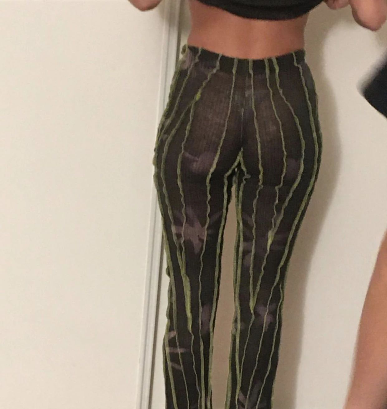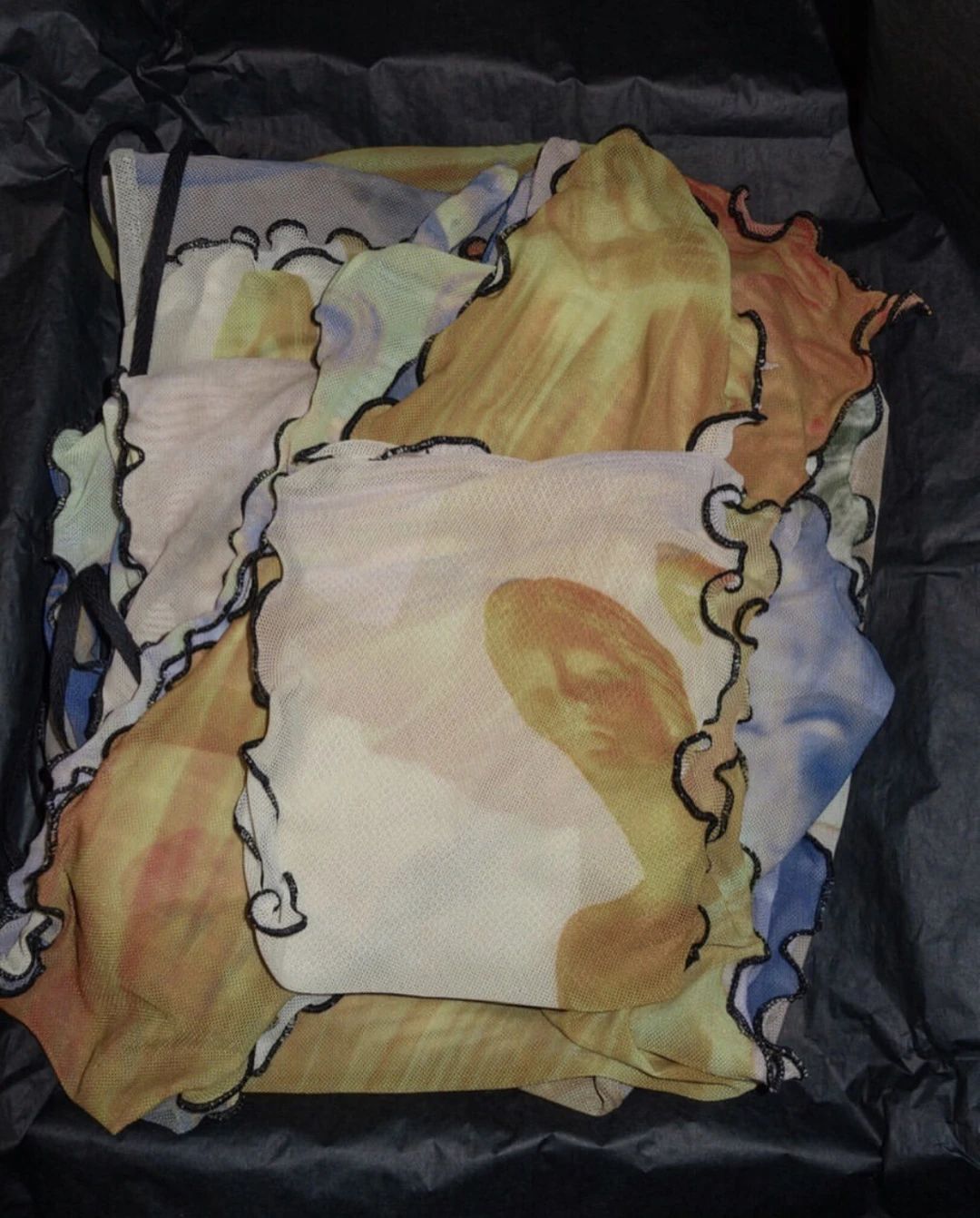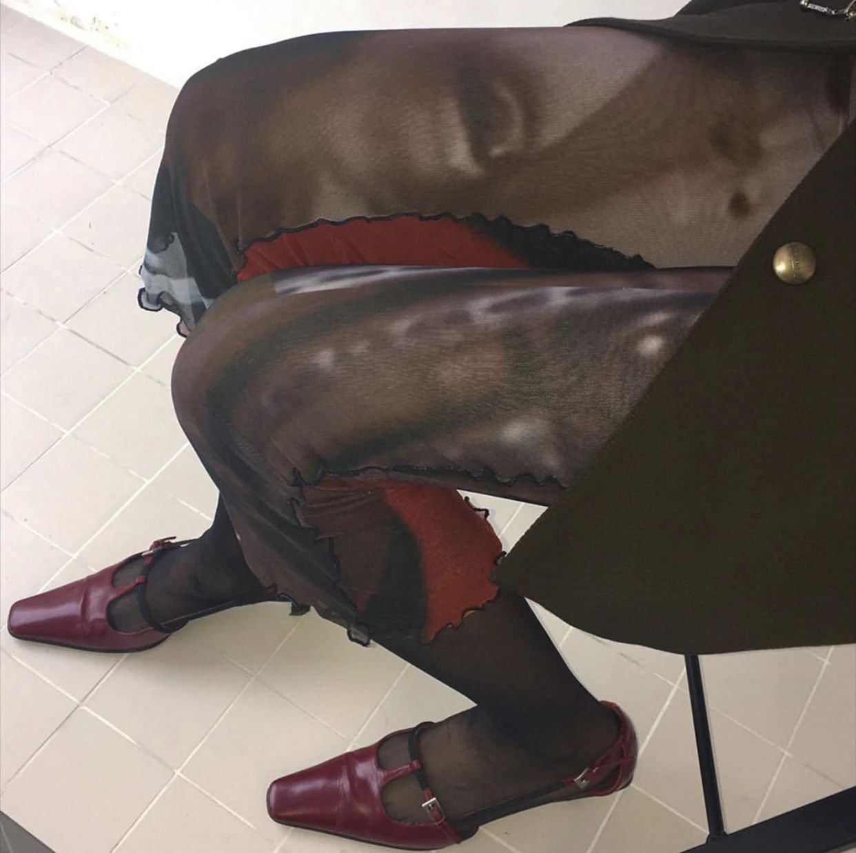 还有这款印花网状镂空裤子,一对网纱长裤,饰有AUNÉ的TROMPE L'ŒIL雕塑作品,由柔软的网眼面料制作而成。侧面露出波浪状边缘针脚。