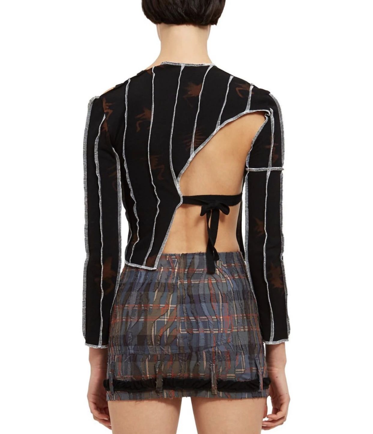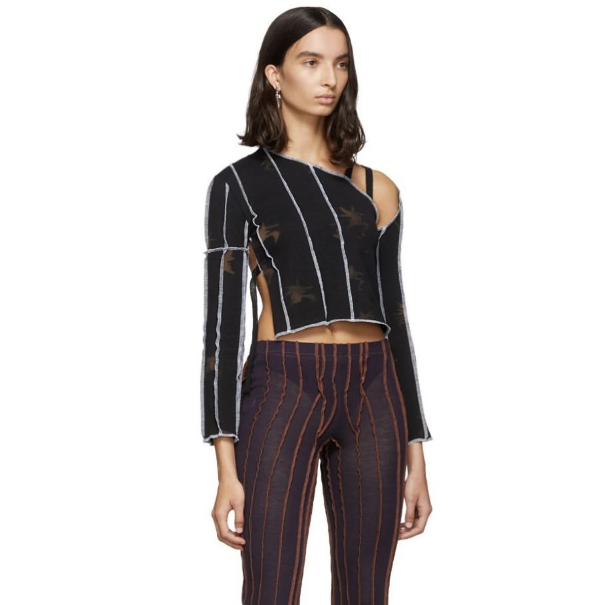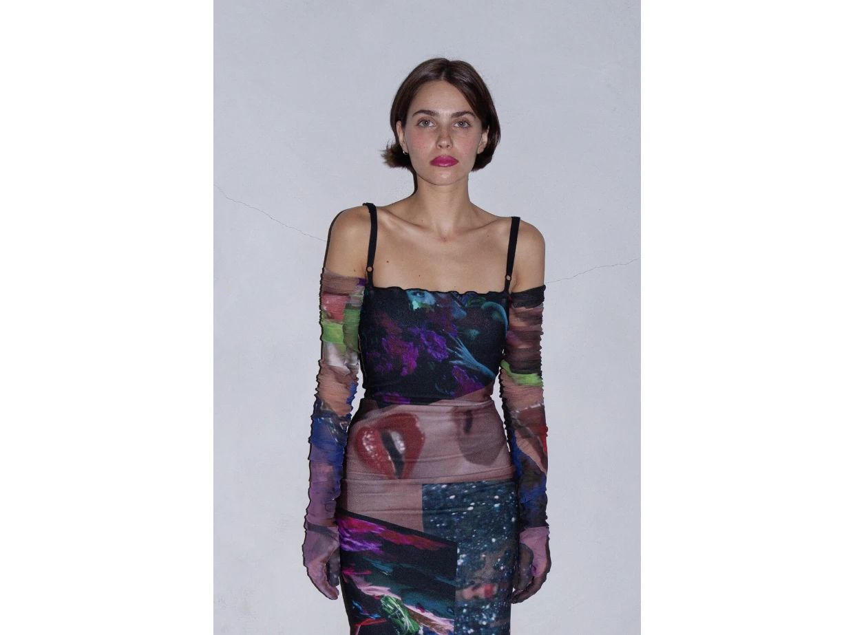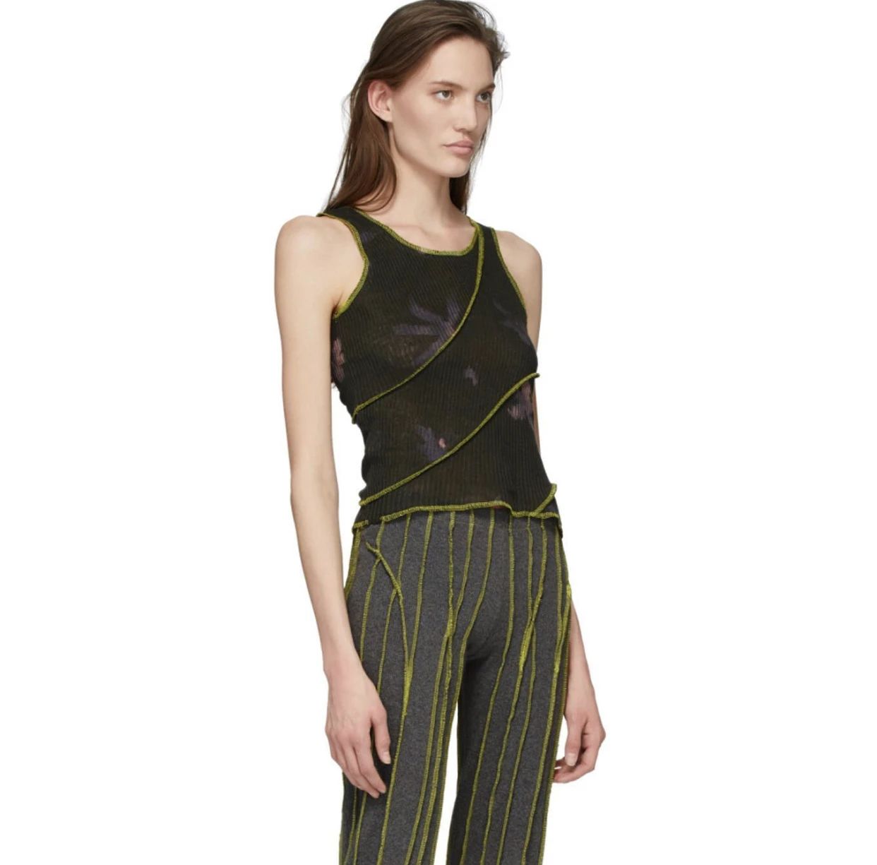 还有这款印花网状镂空裤子,一对网纱长裤,饰有AUNÉ的TROMPE L'ŒIL雕塑作品,由柔软的网眼面料制作而成。侧面露出波浪状边缘针脚。