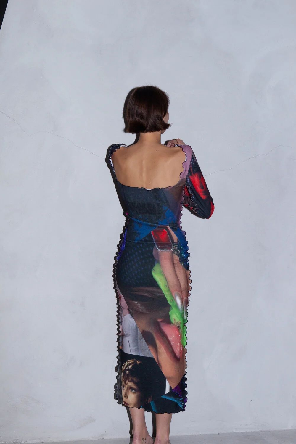 喜欢连衣裙的姐妹们,这款绉纱长袖连衣裙就很不错。由柔软的弹力绉纱制成。方形领口,后背用波浪形黑色对比边缘细节和领带细节。