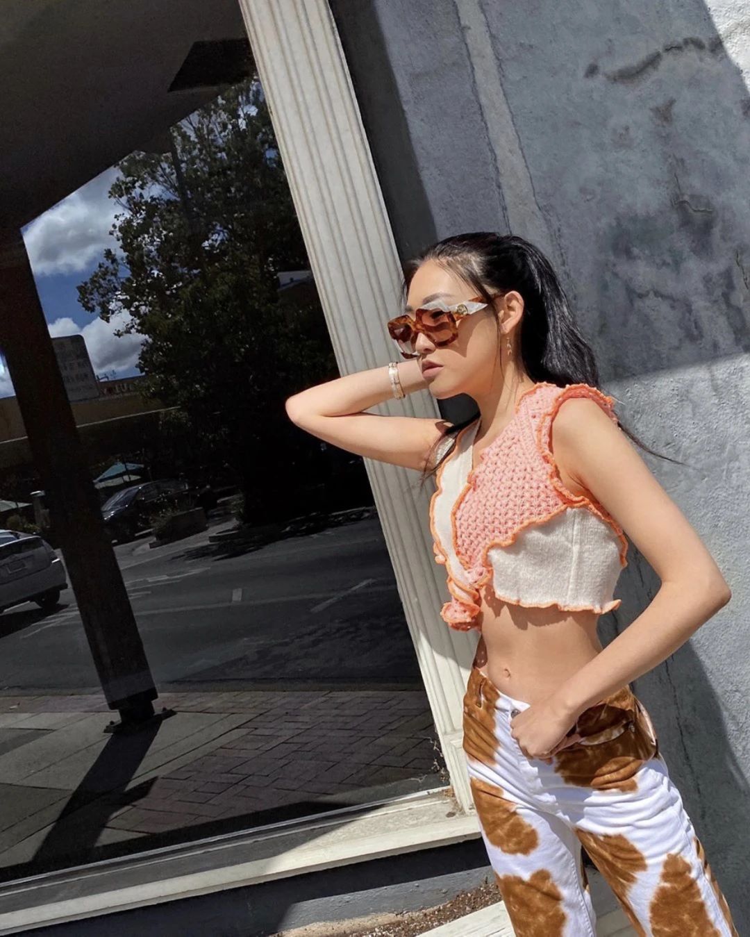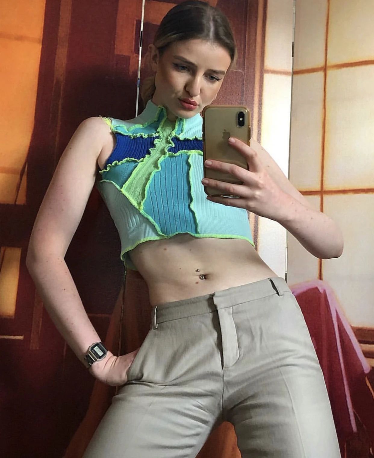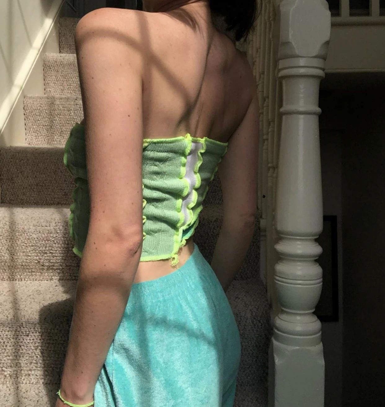 这款浅蓝色的的小背心,边角的外露设计,深浅颜色的运用,穿起来又飒又甜。