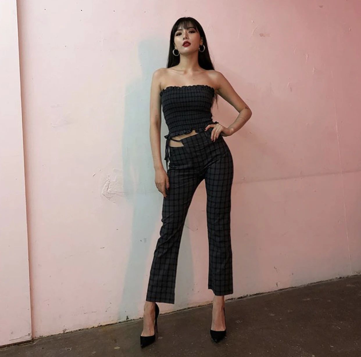 甜辣泫雅当然不能放过这个牌子,格纹褶皱抹胸与格纹长裤进行搭配,性感又干练。