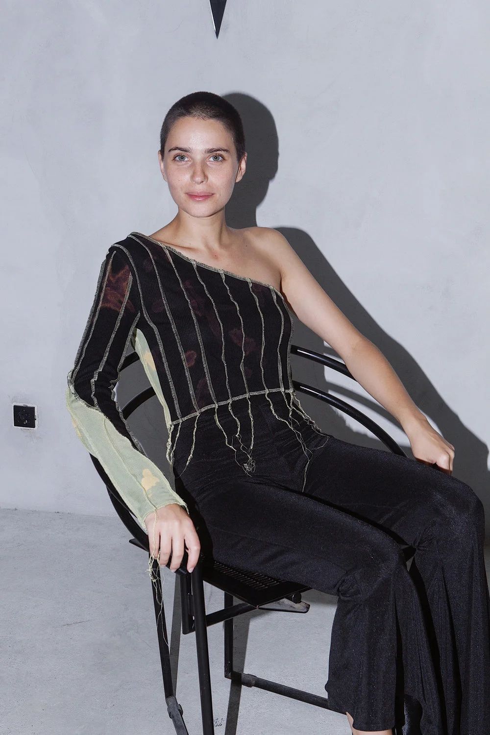 Helena Manzano善于运用3D条纹与不对称上衣的结合,再配以手工印花棉质汗衫。