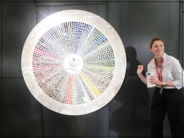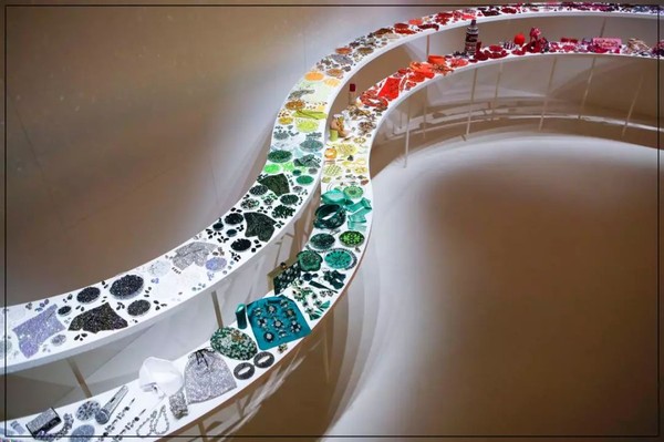 展馆的二楼摆放着一个巨大的水晶转盘,展示着施华洛世奇创造出的不同颜色、不同切割、不同大小的水晶元素,像个七彩的水晶元素漩涡每次转动都闪着让人炫目的光彩。圆盘中间的雪绒花是品牌最早的Logo。
