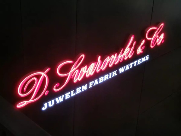 一进门红色霓虹灯显现着品牌最原始的Logo D.Swarovski & Co.,这里的每个细节都在告诉我,世人对这个世界闻名的品牌了解得远远太少。