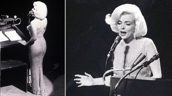 美国著名影星玛丽莲·梦露(Marilyn Monroe)为肯尼迪总统生日庆典献歌时穿着的银色裹身裙