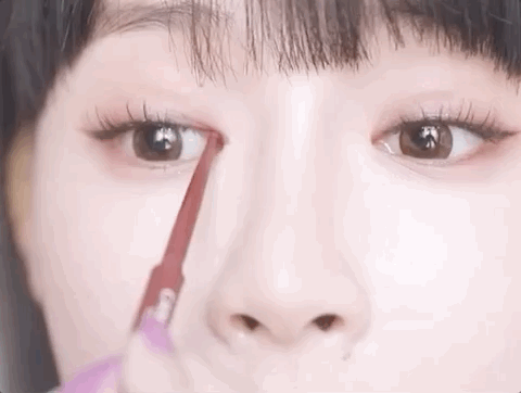 STEP1:选择颜色柔和贴近内眼角肤色(棕色、红棕色系)的眼线胶笔,直视镜子以斜向下的方向,画出你想要的内眼角形状。