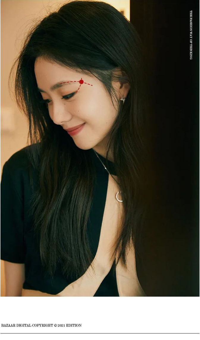 放大一看,你会发现就连眼形看似很完美的热巴,其实她的眼线也是粗细不一的。点击下图放大 不仅如此,对比之前的照片,左边这张热巴的眼线以内眼线为主,基本没有拉长眼尾,眼睛看着更圆润,整体感觉更加清纯。而右边这张则强调了上扬的眼线画法,也是热巴比较惯用的画法,同时,眼头部位也强调了一下,不仅气场上看着更强也更搭她的眼形。都说换个眼线换个气场,这话真不假。