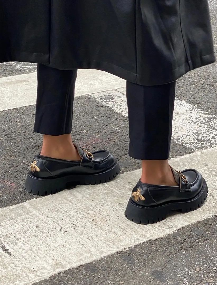 LOUIS VUITTON这双厚底乐福鞋上脚也很耐看。老花鞋面是这双鞋子的一大亮点,配上Dauphine的金属标识和圆润的鞋头设计,有种英伦学院的气质,时髦感瞬间满分。GUCCI的平底马衔扣乐福鞋向来是经典中的经典,但今年还是被新出的厚底款式抢占了风头。呆萌的圆润鞋头和锯齿状的厚款鞋底,看起来要稍微笨重一点,但挡不住它的魅力。