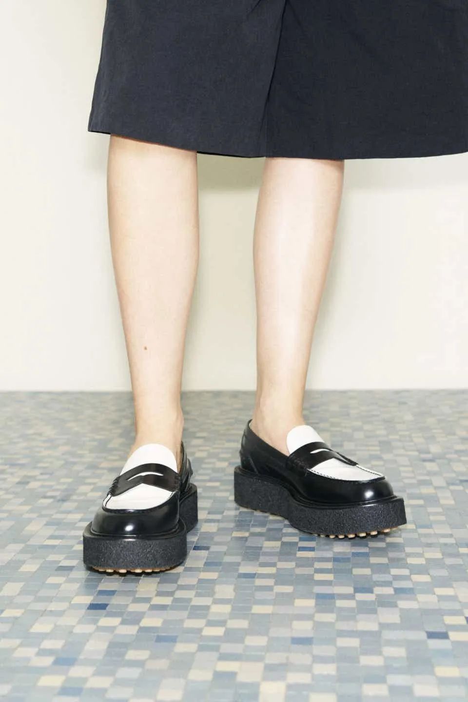 除了厚底款式,今年买乐福鞋还可以试试拼色设计。撞色细节会让整个鞋子看起来更吸睛,既经典又有些小特别。黑白拼色是首选,不少品牌都有。上面提到的LOUIS VUITTON厚底乐福鞋就有一款黑白拼色的,对比强烈的色调让鞋面更加俏皮,比老花图案还抢戏~