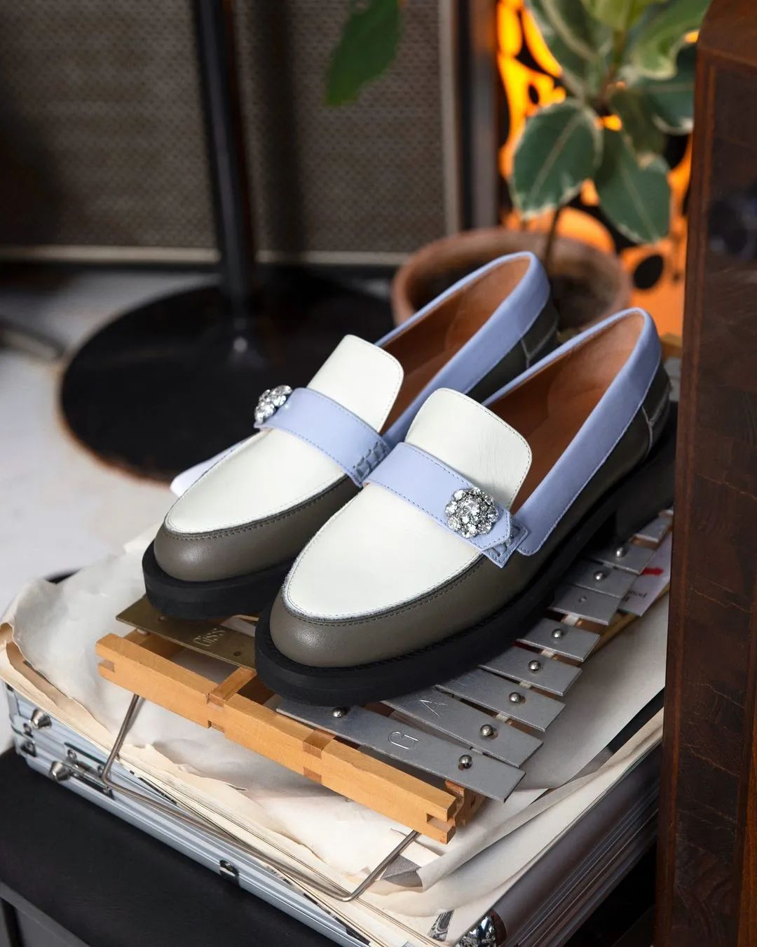 不想撞款的,还可以选择来自法国巴黎的小众鞋履品牌Nomasei。这双拼色的乐福鞋是和双胞胎时尚博主Reese Blutstein 、 Molly Blutstein 推出的联名款,鞋面上除了拼色设计,还有品牌金属标识,方头设计比尖圆头更帅气,随便怎么搭都好看。
