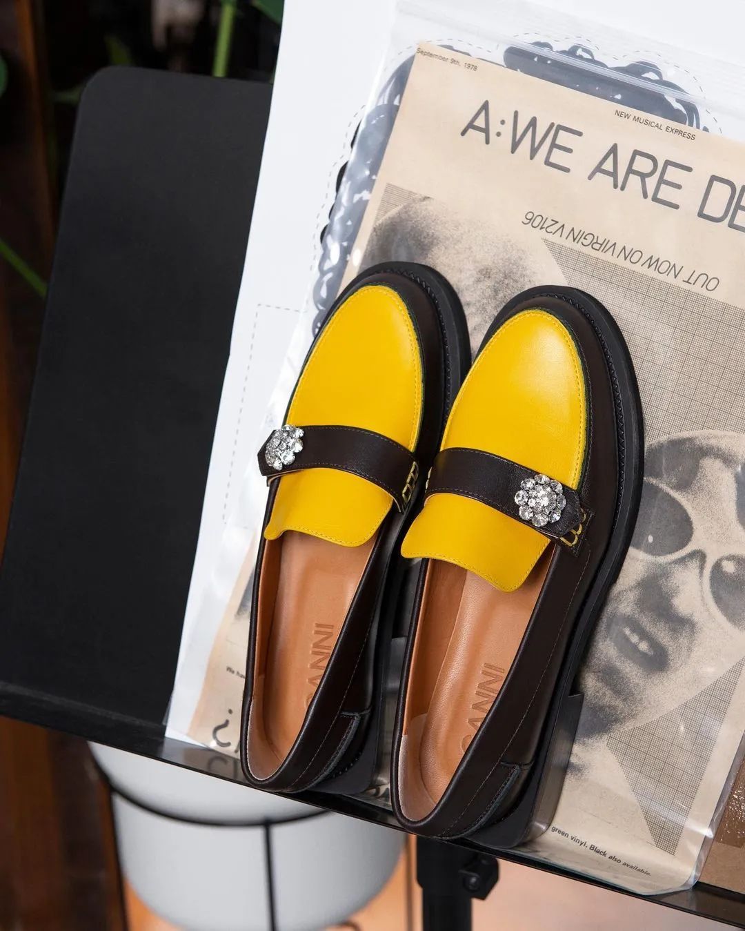 GUCCI这个小粗跟的版本加上偏窄的鞋头更显秀气。鞋面上还有流苏装饰和精致的金属Logo细节,不至于看起来闷闷的。喜欢明亮色彩的,可以看看北欧品牌GANNI。他家在今年推出的乐福鞋上也加入特别的拼色细节设计。色彩活泼的鞋面延续着品牌风格,点缀的水晶纽扣增添了几分精致感。