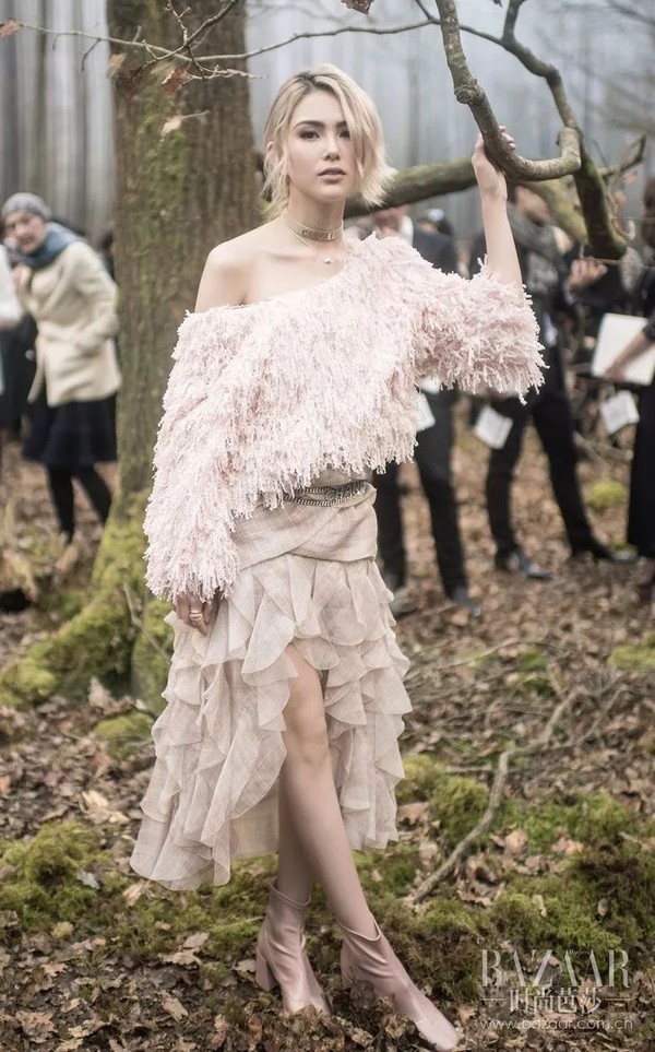 前不久昆凌参加Chanel大秀时,一身春日浪漫粉装惊艳芭姐!绒条毛衣搭配薄纱裙,再踩上一双丝缎靴,材质间碰撞削弱了甜腻。裸粉色的Choker带来些许叛逆,银色的链条腰带更是添了一把火,甜美与叛逆正巧平衡。