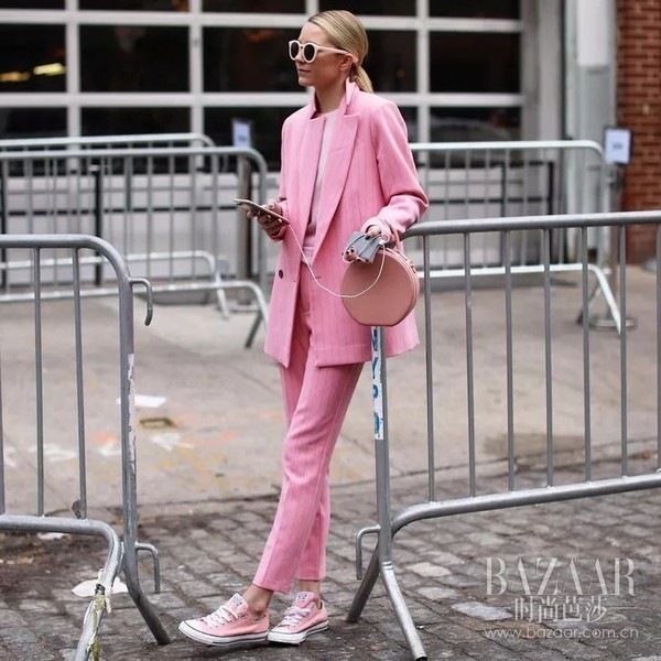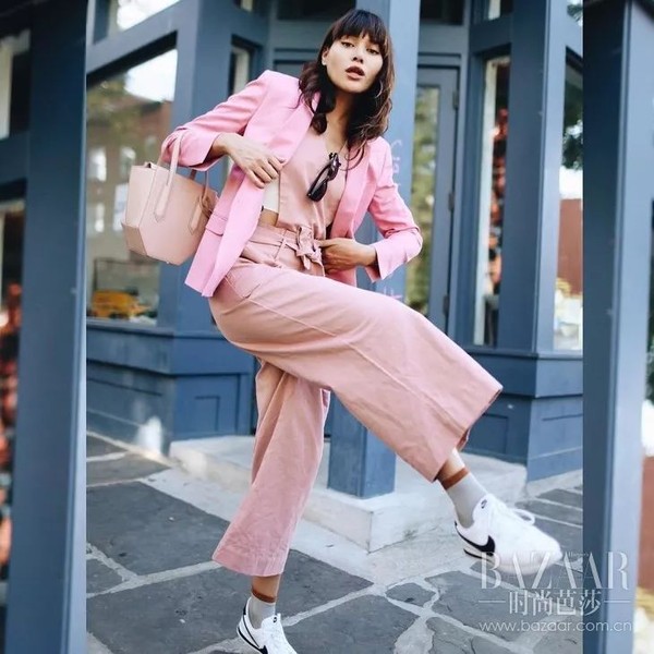 一套粉色裤装控制不好会显得甜腻,踩上一双白色运动鞋立即只剩甜美!小心机在于露出的灰色袜子,灰色可是帮助水粉色系削弱甜腻、立显高级的好帮手~
