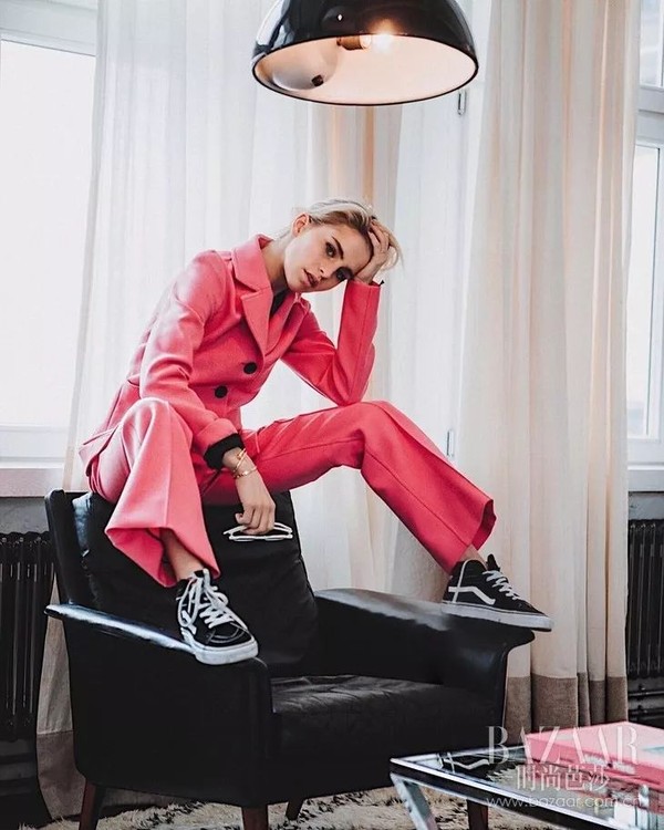 想要碰撞更加明显的话,黑色更满足我们的要求!一身粉的西装套装看上去不够有趣?踩上一双黑色布鞋,甜美与休闲酷劲碰撞有趣又时髦!挽起的外套袖口里露出黑色的内搭,正好与鞋子相呼应~