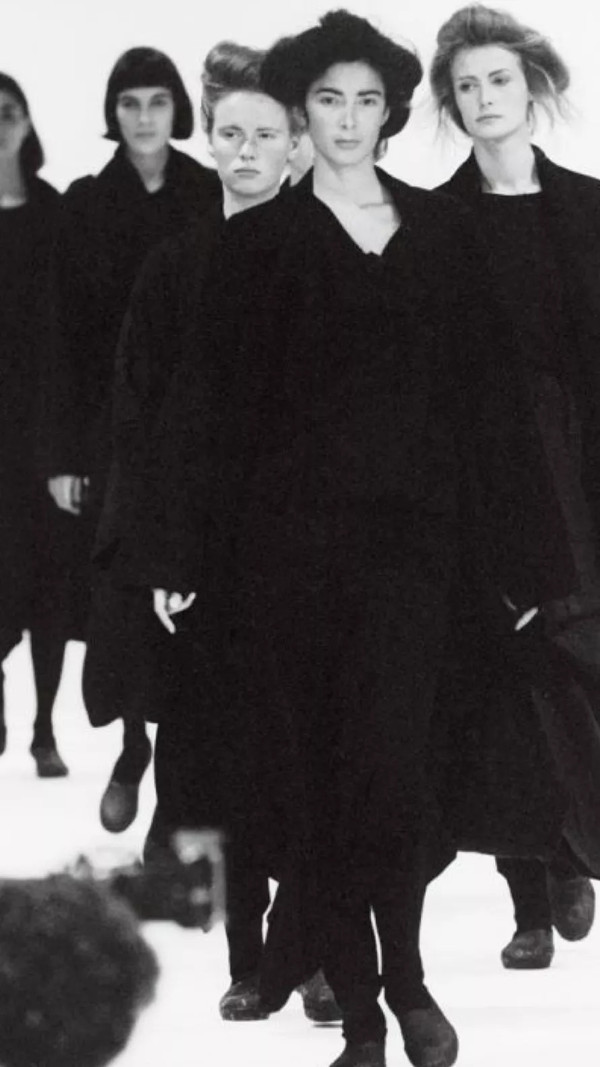 让西方时尚认识到东方世界的黑色魅力,要数川久保玲在1981年那场巴黎时装周首秀。所有的模特均穿着着全黑的时装,缠裹着身体以至于难以露出身体曲线的大码连衣裙。而之所以全部统一使用黑色,是因为她希望与巴黎传统的光鲜亮丽却无聊的高级时装相区别:她希望制作出焕然一新的时装,黑色也自然而然成为了她的武器。这一个系列一经发布就立刻引起了轩然大波。