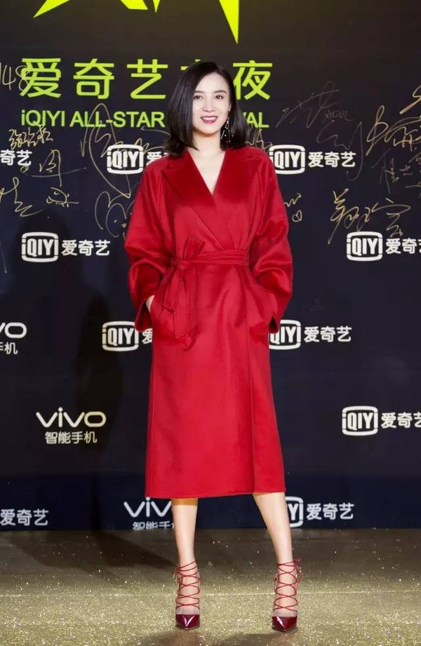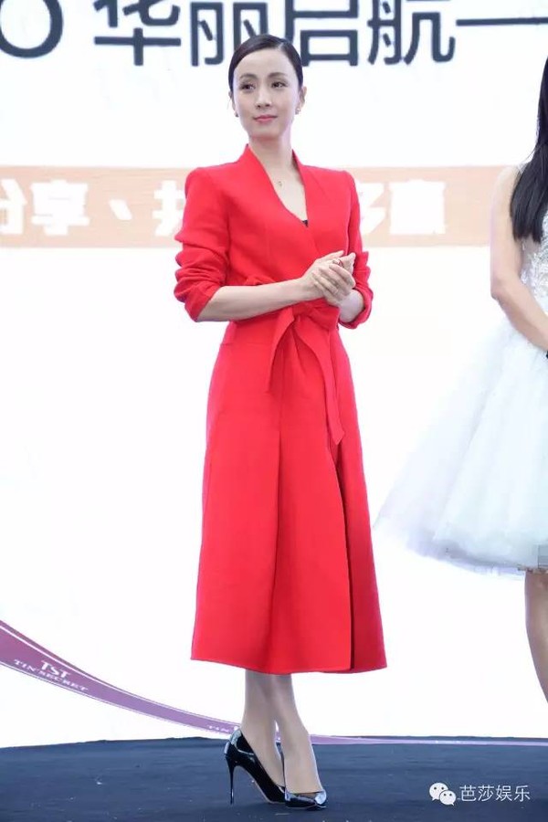 陶虹穿一件简单的红色浴袍大衣就可以优雅大气,系带蝴蝶结很好的突出了她的腰身。