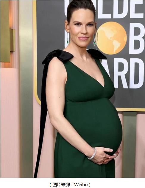 准妈妈希拉里·斯万克身穿绿色无袖长裙,耳畔铂金镶嵌祖母绿宝石及钻石的夸张耳环来自蒂芙尼(Tiffany & Co.)古董珍藏库,和礼服颜色相呼应,尽显温柔端庄。