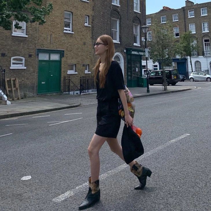 要耍酷少不了硬朗的短靴,很多女孩更是在夏天也不愿脱下,但短靴容易在视觉上将腿长“截断”。宋智英也很注意这个细节,看看她的穿搭,基本上只爱高跟短靴!