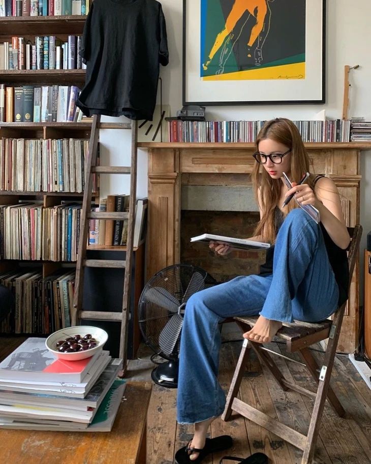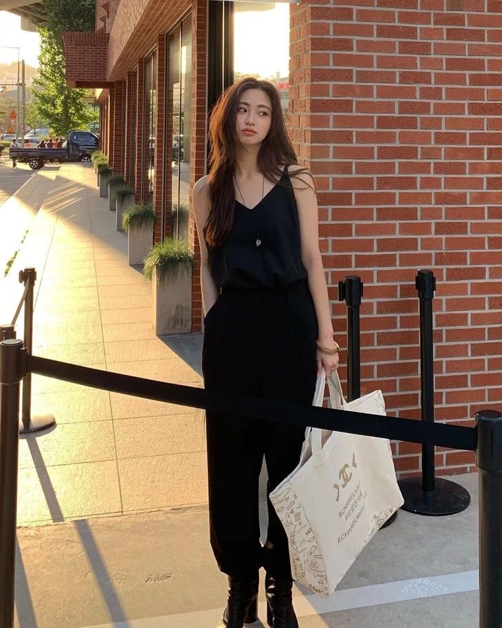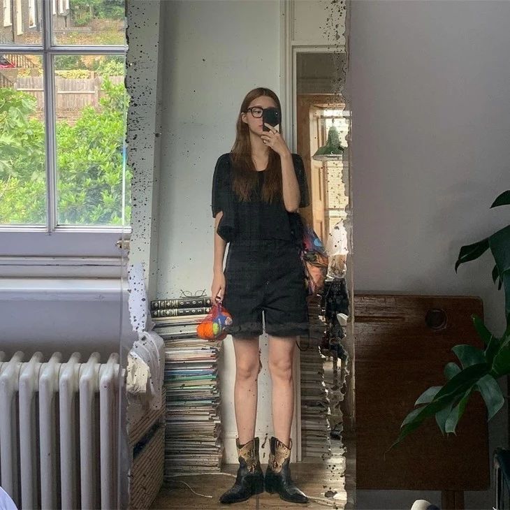 简单的黑吊带➕牛仔直筒裤,一副文艺气息十足的黑框眼镜就是全部配饰了,“天然去雕饰”的模样却穿出了一位热爱艺术的学院女孩的样子。