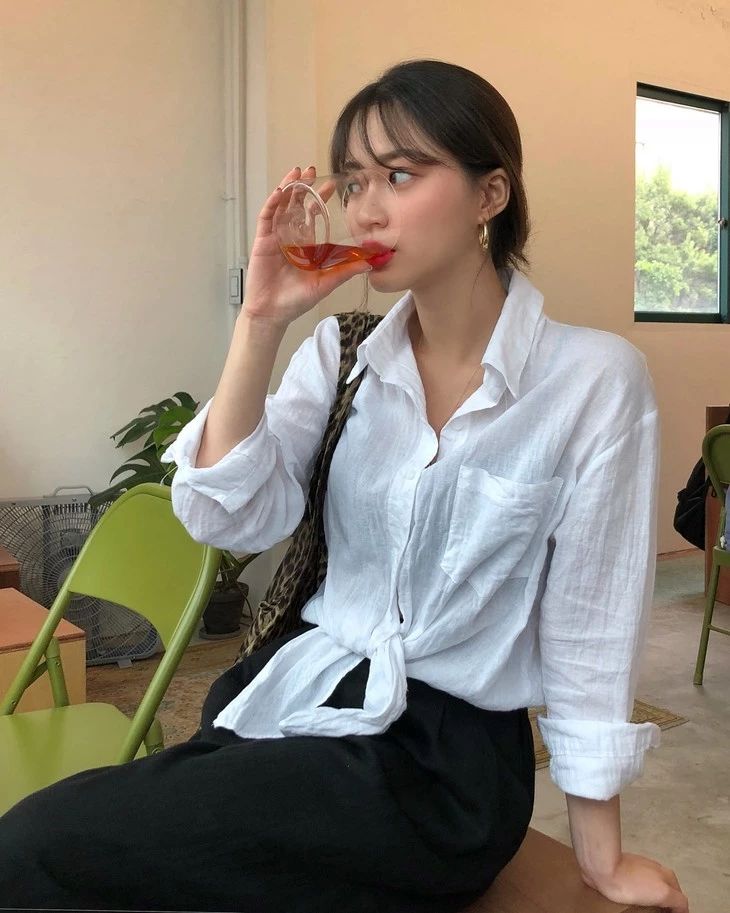 智英也不会过多地露肤,基本都是宽松的搭配,但是却会通过提高腰线来调整比例。越是宽松的搭配,越要凸显比例。像她一样把衬衫两侧下摆打结DIY出腰线,就是不错的选择~