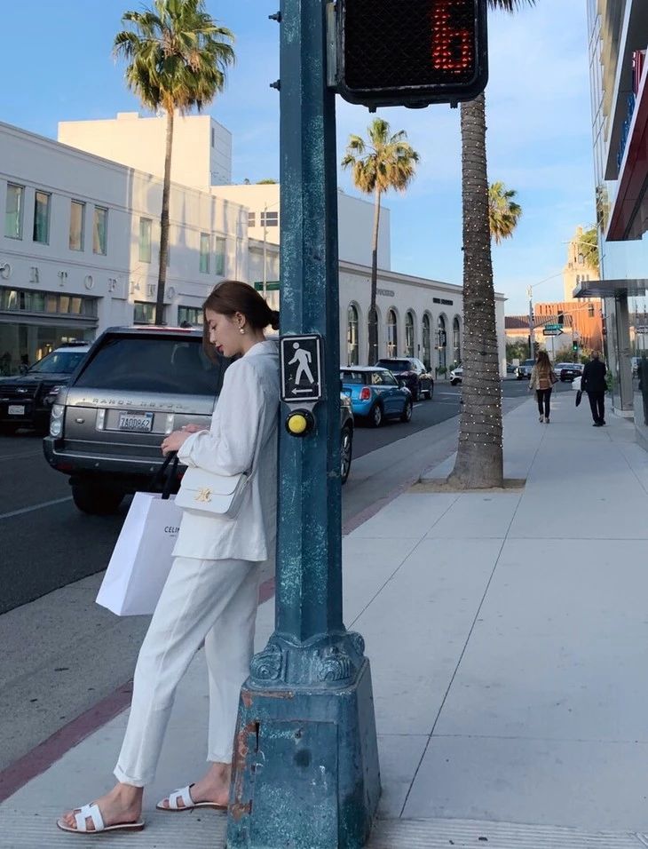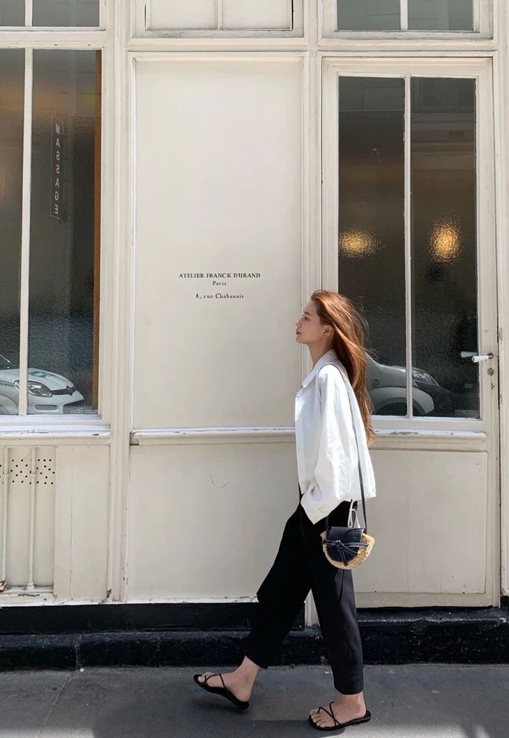 白色西装套装Look大气又利落,可很多小个子女生是不敢轻易尝试的,自己娇俏的身高分分钟被“吃掉”。那不记下仿智英的搭配重点,露出修长纤细的颈“脖子”和脚“脖子”,可以起到挺拔整体姿态的效果,也给人利落的感觉。