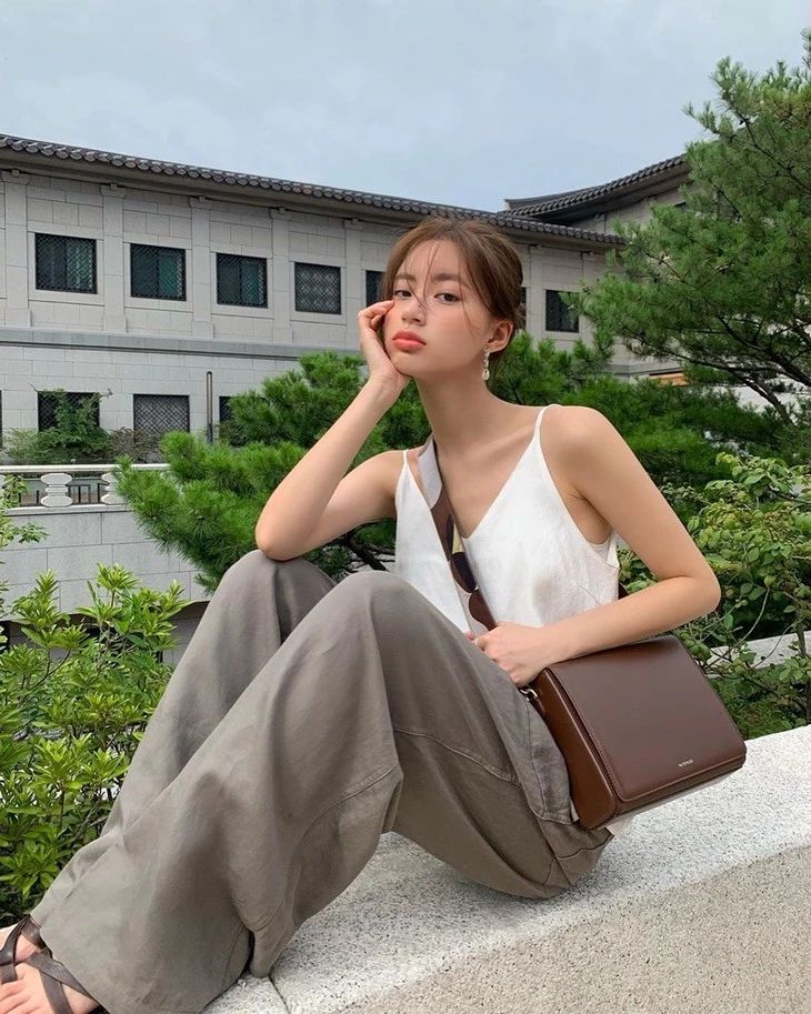 松松垮垮的白色吊带搭配灰棕色超长裤与棕色凉鞋,大面积的棕色调非常容易带出质感,营造层次的同时带来高级感,非常凸显气质。Effortless Chic感就这样被轻轻松松地带出来了。