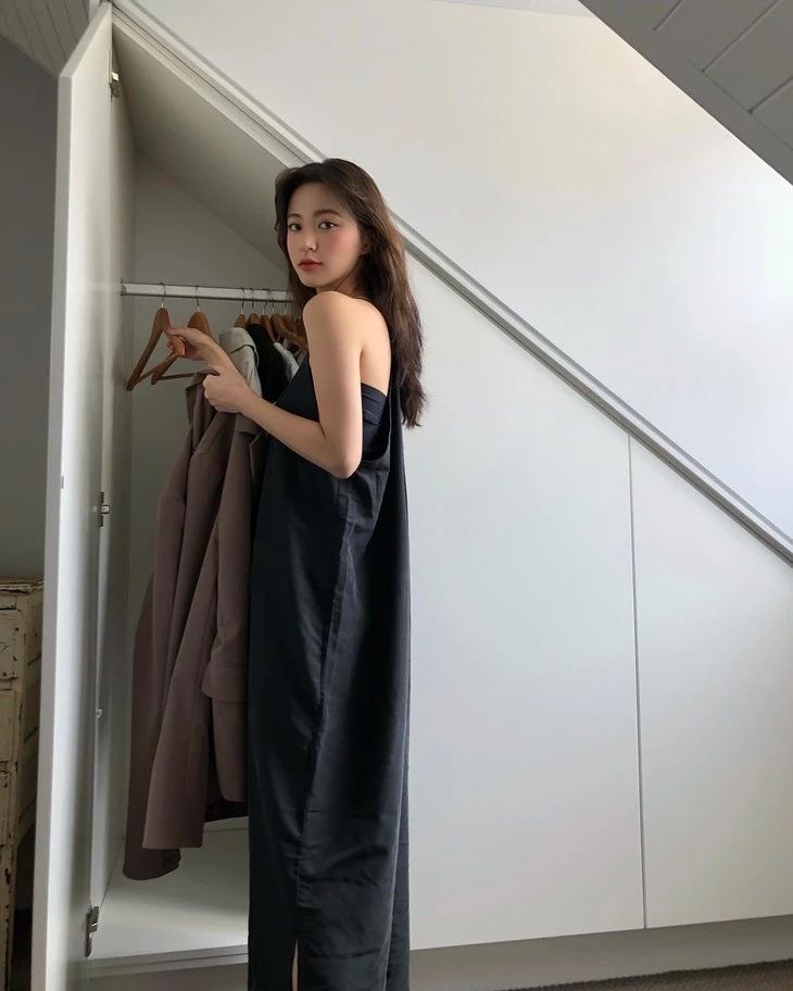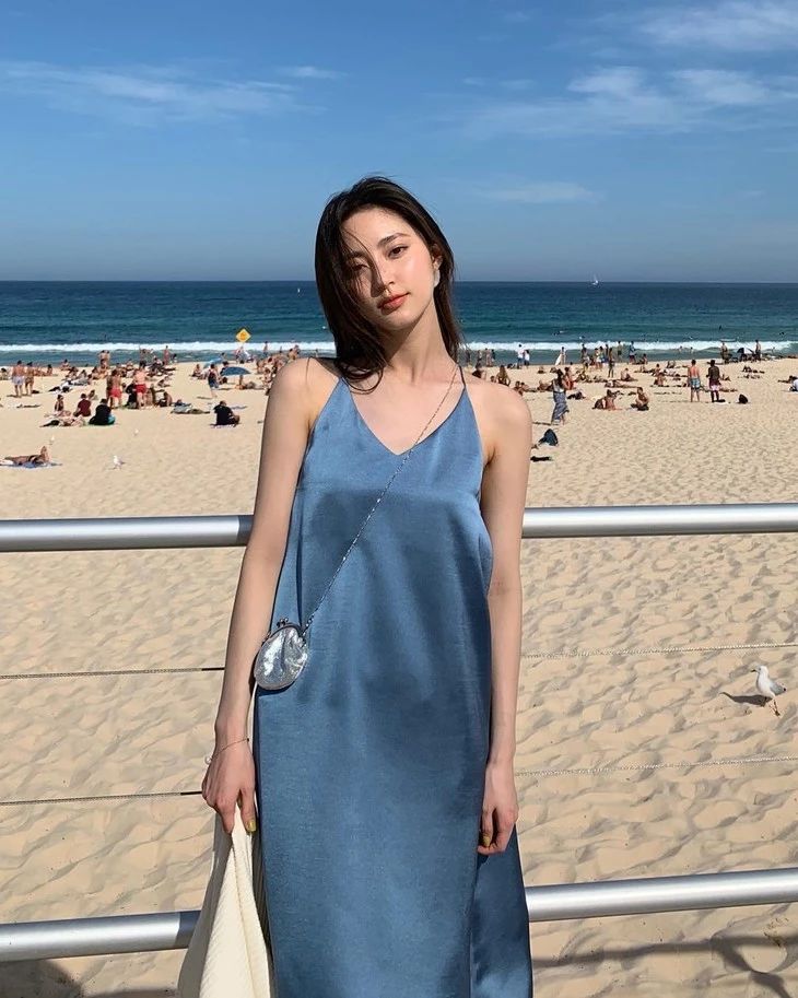 如果觉得做搭配太复杂,那么不如直接学智英做“减法”。任凭长款吊带裙自由垂下,只露出颈脖,也是另一种优雅的迷人姿态。