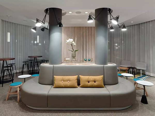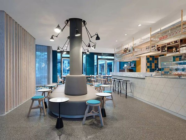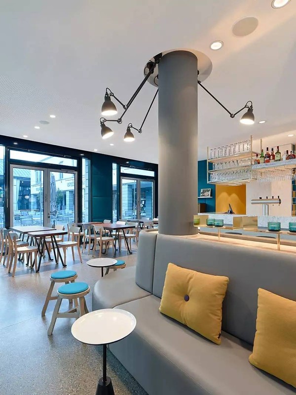 中间位置有一个酒吧,周围有各种类型的座位可供选择,以适用于不同的情况,两个原始柱被转变为软垫凳的主干