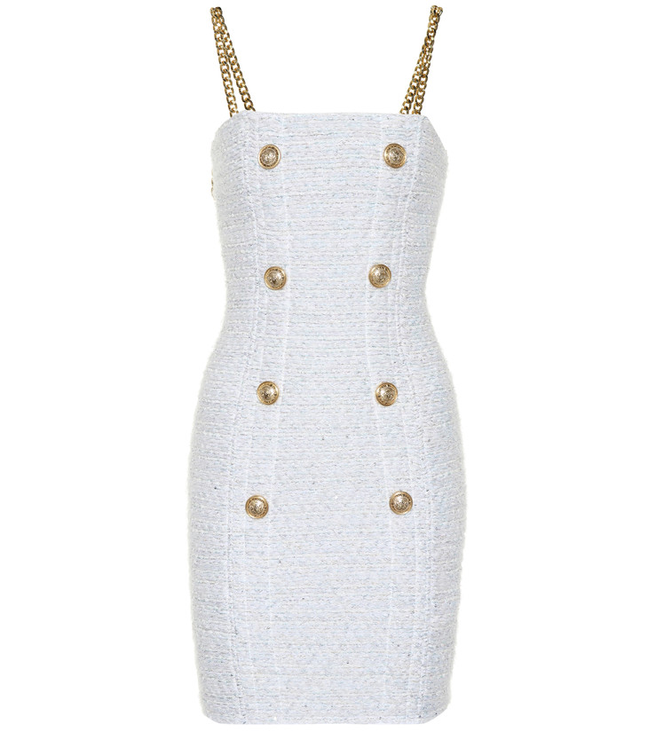 这一系列重新诠释了冬季服饰的魅力,其涵盖晚宴裙装、收腰长款垫肩夹克等款式,呈现强烈的女性审美风格。十件胶囊系列单品涵盖了三件夹克包含Balmain标志性的剪裁夹克、三件连衣裙、两条迷你半身裙,一件无袖印花棉背带裙以及一件印花棉运动衫,价位从€195到€1,790不等。