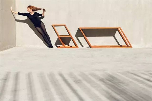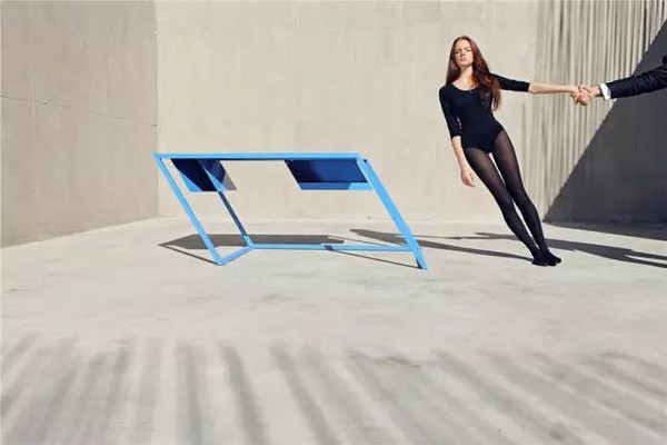 将桌椅扭曲到匪夷所思的角度意在使人体自身的柔软曲线在这种不平衡中与其碰撞出了和谐的韵律