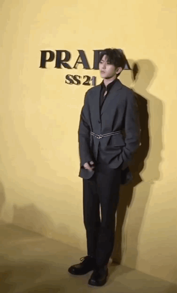 蔡徐坤身上穿的是来自2020秋冬系列的灰色腰带西装,搭配黑色衬衫、长裤和经典的皮鞋,用一根腰带束紧的宽肩廓形西装随性又时髦,完美衬托出王子般的优雅气质。
