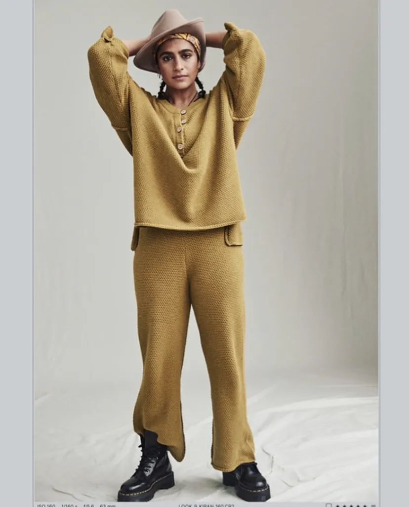 不仅颜值高,质地更是舒服柔软,其采用的所有面料均为棉质面料,柔和贴身,显色度也很好,时装博主Renee身穿红色阔腿针织裤搭配半高领坎肩,休闲又时髦。