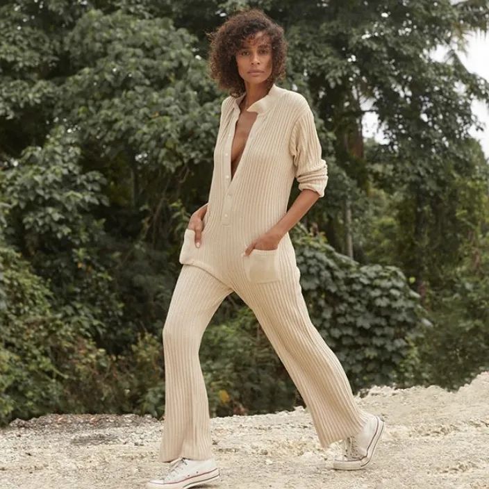 Isabelle Mathers身穿的这件针织连身裤光是看着时髦程度就在直线飙升,适当的挖空设计与针织绑带相互交错,高腰长裤也能完美拉长腿部线条!