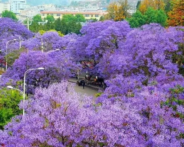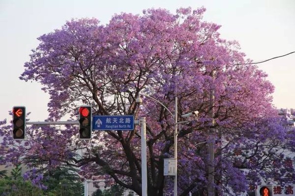 一环路蓝花楹掩映着老宅和中式桥梁。