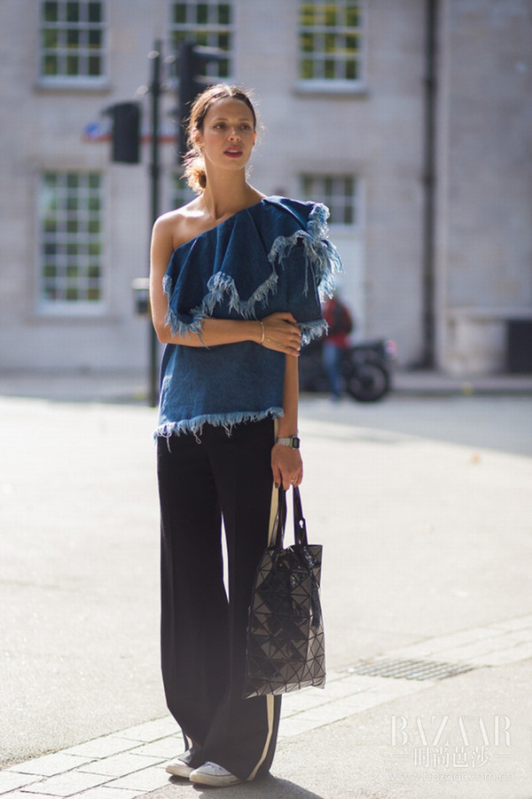 斜肩式的牛仔上衣,搭配今年hot不行的运动裤,再踩上一双球鞋嬉皮又街头~