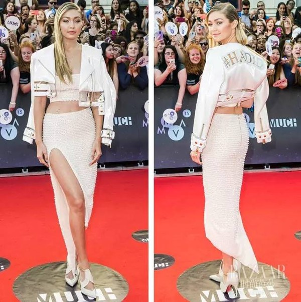 Gigi穿着这身定制款的Mikhael Kale套装,在红毯上穿印着自己的名字的衣服,简直太酷!