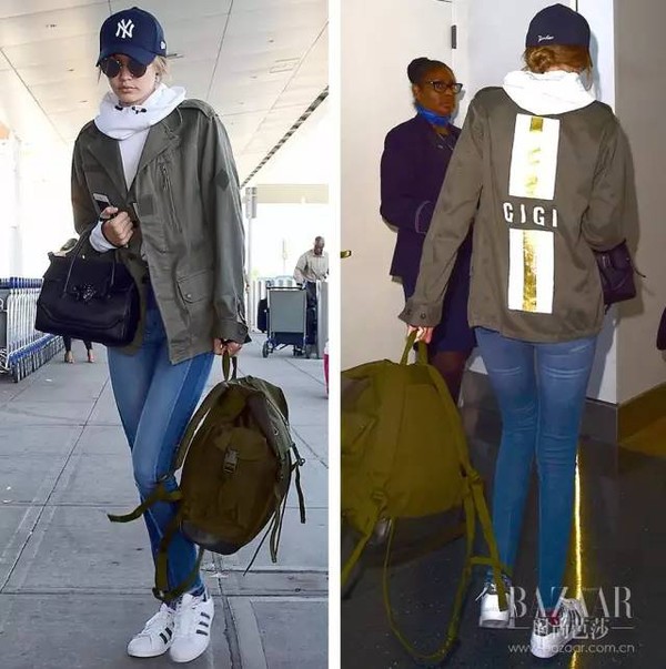 现身机场时还穿着印着GIGI的定制款Romi军装外套,去哪都自信又拉风~