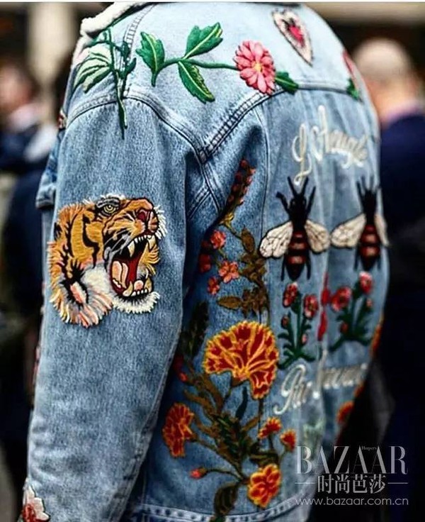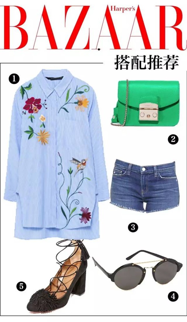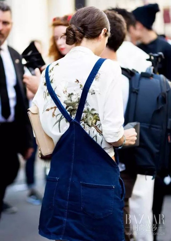 以前传统正式的衬衫在今年也按耐不住了!像这件刺绣印花的衬衫就搭配一件背带裤回头率十足!