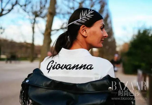 Giovanna Battaglia穿着这件印着自己名字的衬衫,搭配机车皮衣个性十足!
