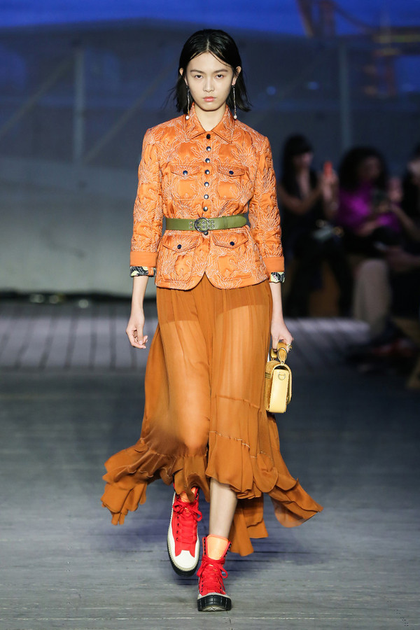 当晚时间7点30分在位于西岸的龙美术馆,大秀伴随落日缓缓拉开序幕。开场模特是最近颇具势头的我国新晋模特赵佳丽,让人十分惊喜。她身着收腰西服外套搭配轻柔飘逸的透视半裙,柿色配色呼应着夕阳余晖,将大家慢慢带进Chloé的巴黎&上海“双城故事”中......
