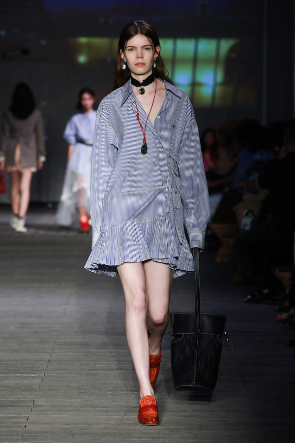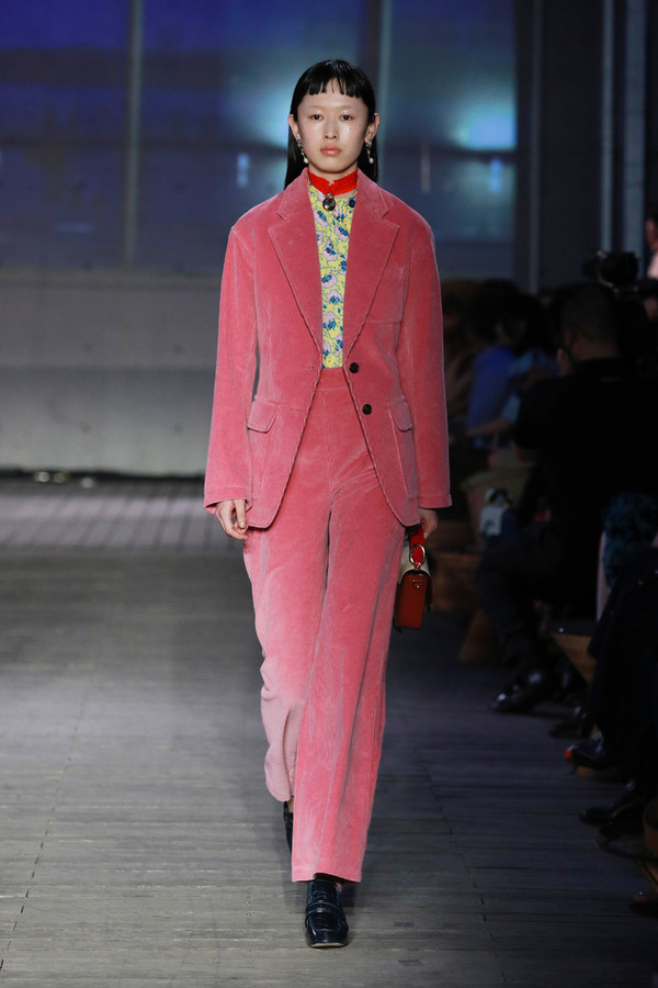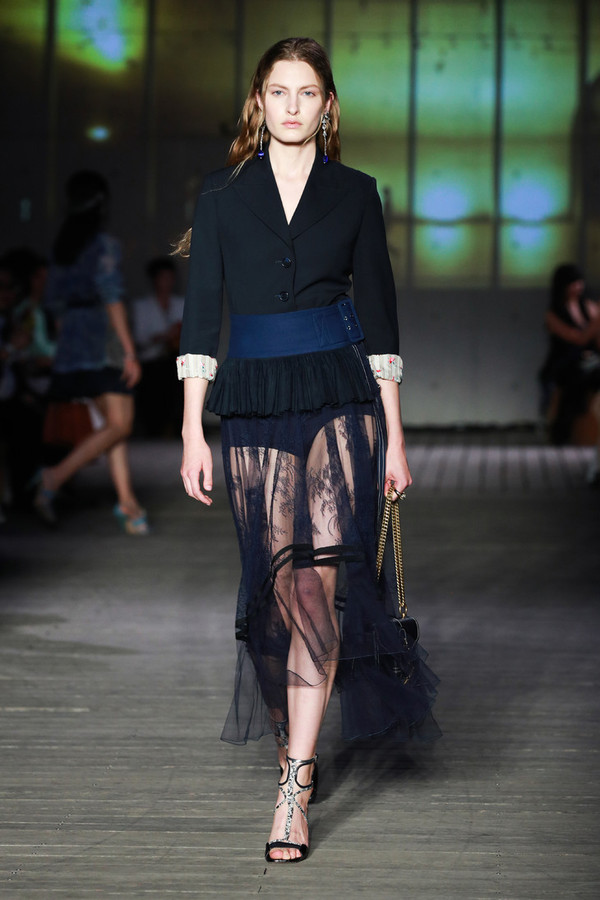 除此之外,面料上的多样性也让大家目不暇接。质感强烈的粗洗牛仔布、灯芯绒和绒面皮,混搭柔软的透明刺绣薄纱、百褶丝绸、乔其纱、羊毛绉纹呢和提花棉面料,杂糅制造出摩登的风格对比。