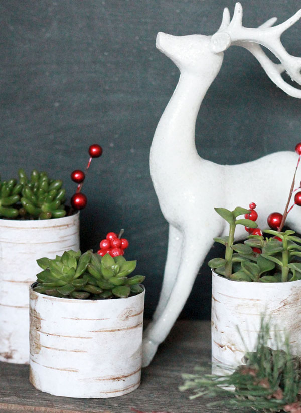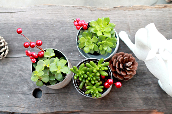 4、把准备好的多肉放到罐头盒里栽好,增加一些圣诞的浆果,让他们变得有节日的气氛。