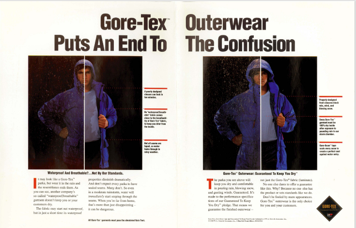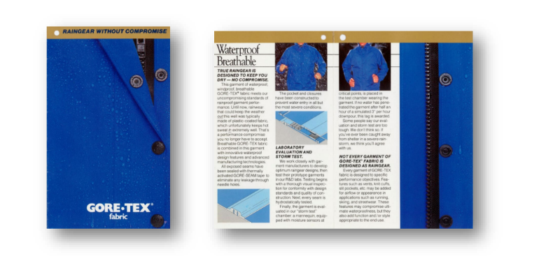 20世纪80年代初,GORE-TEX品牌引入了对面料性能的三年期保修政策,但它并没有涵盖由于设计或加工缺陷而造成的漏水问题。但于1984年,为了制造出真正的持久防水服饰,包括接缝的位置、方向和布局,口袋的构造,拉链上方的翻边使用,GORE-TEX品牌与服装制造商共同制定了 “防水防风服装的设计和结构指南” 。