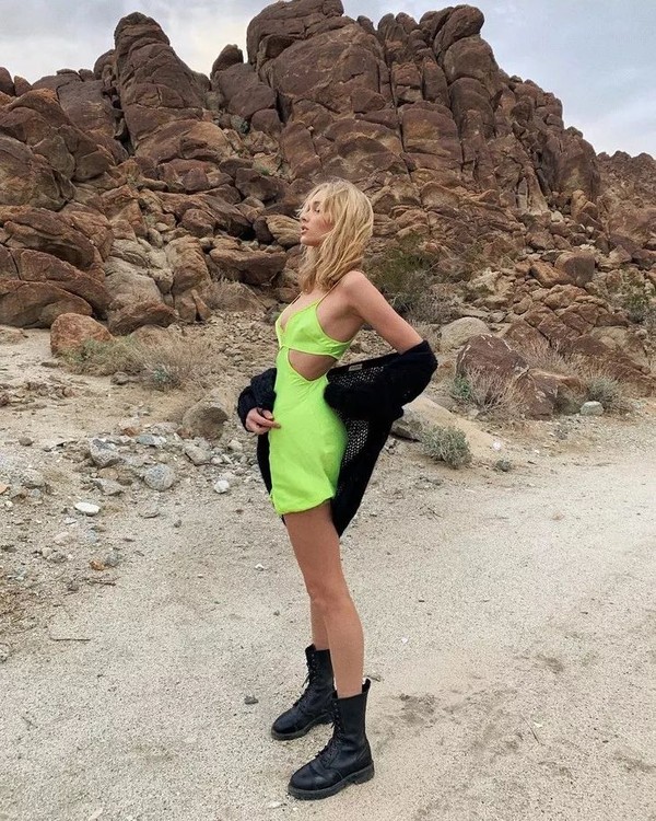 而私底下的她,一件性感睡裙也能变成时髦造型,这身性感的荧光吊带裙其实就是来自Victoria's Secret的挖空睡裙。Elsa却拿来外穿搭配马丁靴,没想到也是过分时髦了,满满的街头感完全看不出是睡裙。