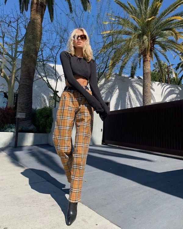 再换一件街头感的Crop Top,照样搭配直筒裤,还是复古的格纹,出来的效果却酷劲十足。墨镜、皮带和靴子都是搭配关键。